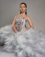 Comencemos entonces el recorrido. En sus colecciones se observan materiales como la seda en sus diferentes opciones; encajes, tules y redes para crear volumen; transparencias y estructuras etéreas, brocados y jacquards, con patrones complejos tejidos directamente en el material, que dan una sensación de riqueza y opulencia; y terciopelo, ideal para crear siluetas dramáticas. Por supuesto que los complementos no podían quedar ausente, partiendo por pedrería, pasando por plumas, hasta llegar a los metales y delicadas flores textiles confeccionadas con sedas, organzas o, incluso, cuero.